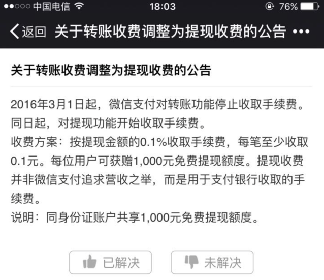 具體收費方案為,每位用戶(以身份證維度)終身享受1000元免費提現(xiàn)額度,超出部分按銀行費率收取手續(xù)費,目前費率均為0.1%,每筆最少收0.1元。微信紅包、面對面收付款、AA收款等功能不受影響,免收手續(xù)費。